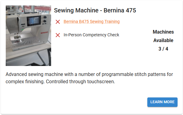 You must complete all relevant trainings to access a piece of equipment! So following the above images, to access the Bernina 475, I must complete;
