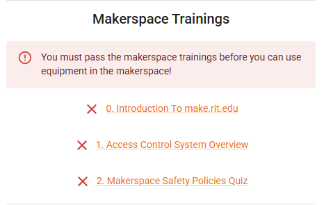 These are trainings required before using any piece of equipment in the makerspace. They can be found by clicking on that makerspace on make.rit.edu, and they will be at the top.