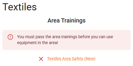 These are trainings that apply to a specific area of the makerspace. For instance, before using anything in the Textiles Area of the Textiles & Electronics makerspace, there is a training to complete.
