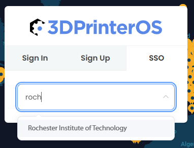 You must access the printers via SSO (single sign-on) with your RIT account. Do so at the link above, or on the 3DPrinterOS login page, hit "SSO" and select "Rochester Institute of Technology" from the list.