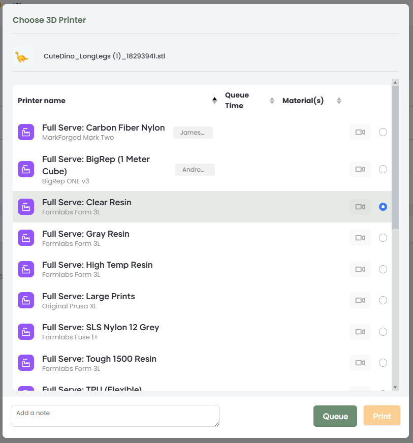 You will also see the self-serve printers at this stage. Sending your STL to one of these will not result in it being printed. Make sure to choose a printer whose name starts with "Full Serve"