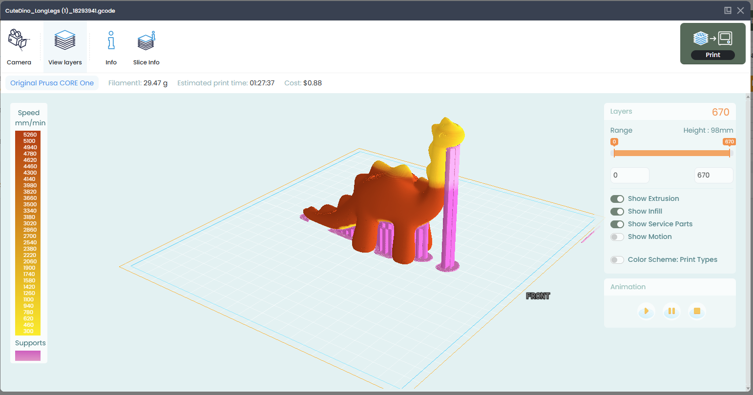 In this view, you can see your 3D print as it will print on the printer, including support material. Check to make sure the support material is where you want and expect it to be.