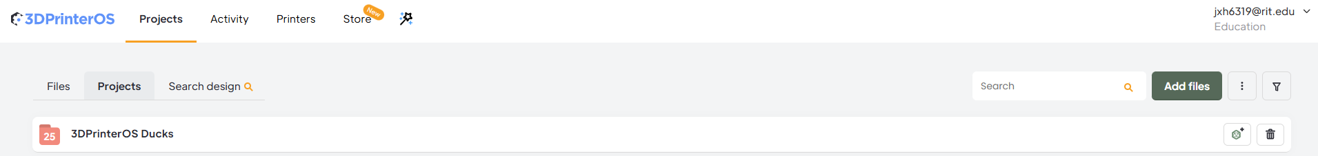 The projects page is also where you prepare files for 3D printing, see 3D Model Preparation below for more information on this.