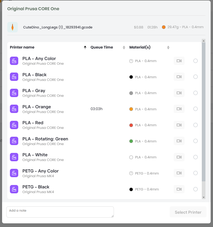Queues are sorted by color and material. To make sure you are printing to the right queue, match the printer type at the top of the screen to the printer type listed on each queue.