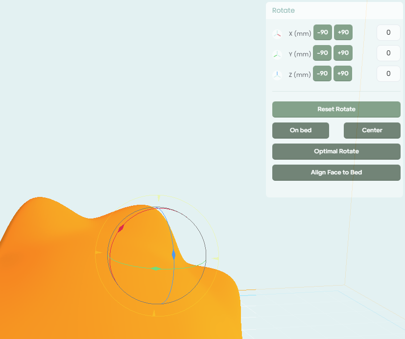 If you have a specific face or edge you want to be touching the bed, you can select it with the "Align Face to Bed" tool. Alternatively, you can have the system try to guess what face is best to have facing down with the "Optimal Rotate button".
