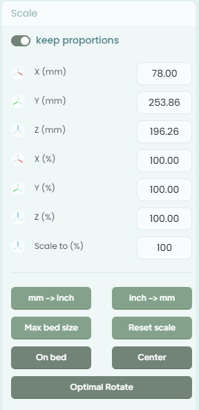 All units in 3DPrinterOS are millimeters. If you know your item's intended size you can enter the X, Y, or Z values in the Scale menu to automatically adjust the size. By default, changing one will cause the other two to proportionally adjust. You can disable this by checking the "Keep Proportions" toggle.