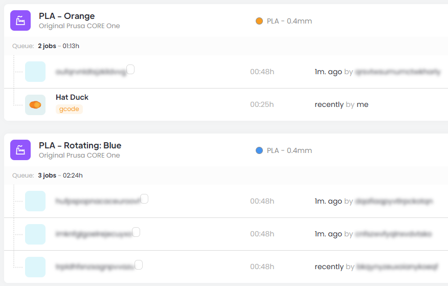 Parts nearer the top will be printed next. You can see a time estimate next to each print. Your print is the only one(s) that have details visible.
