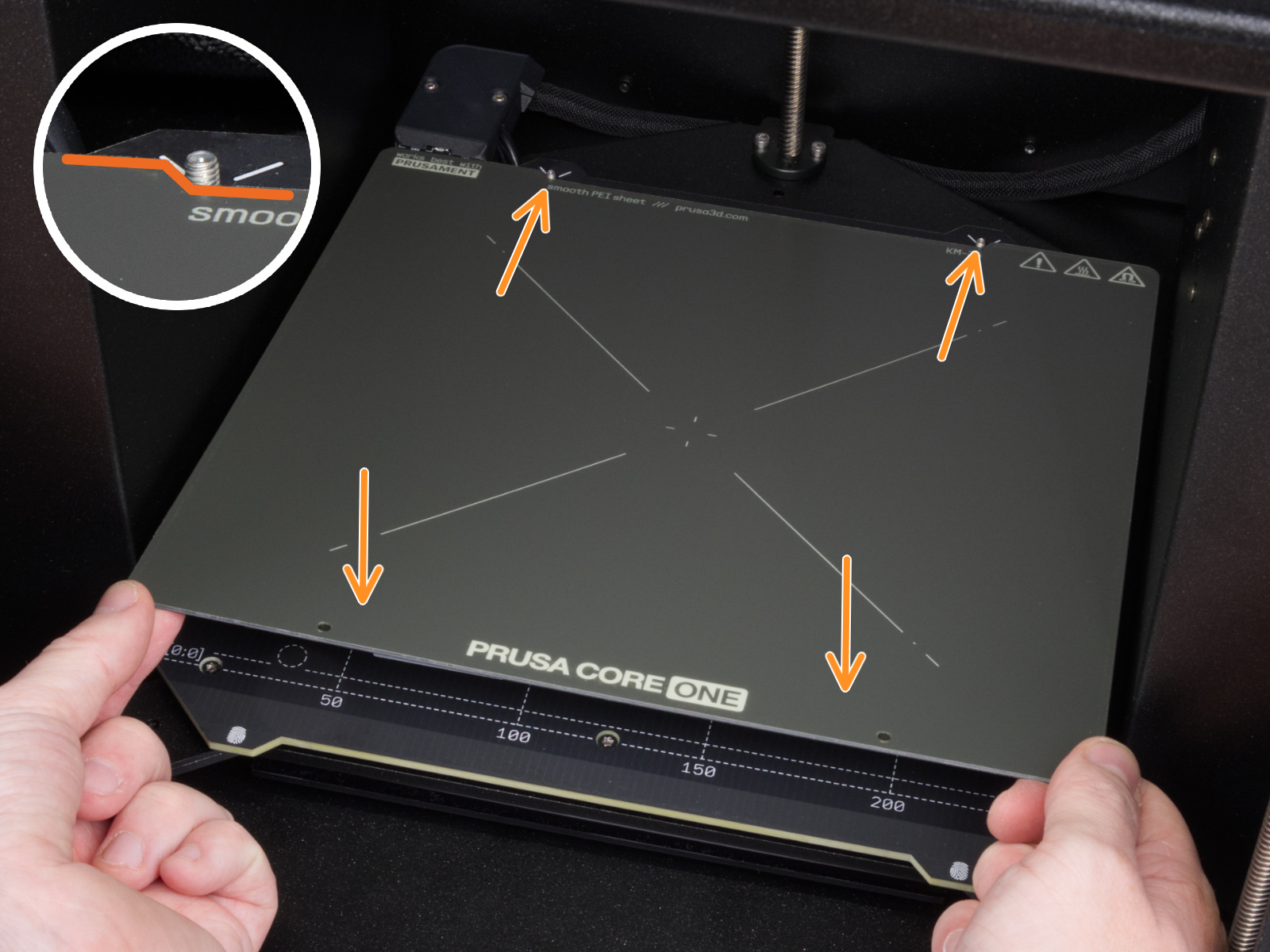 Once the print bed is clear, re-install it by sliding it along the surface of the magnets, until it hits the hard stops in both back corners.