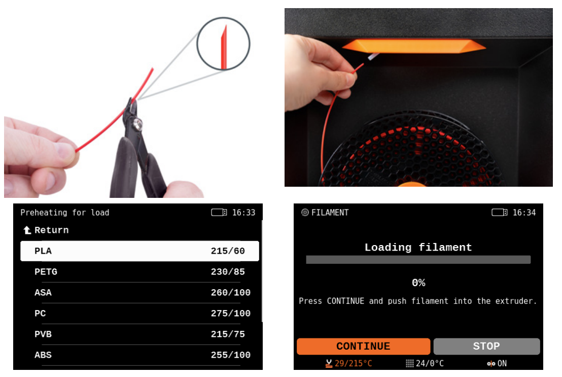 - Cut the filament to a sharp point and push it through the PTFE tube all the way to the Nextruder. Once it reaches the filament sensor in the print head, the loading process will begin automatically.