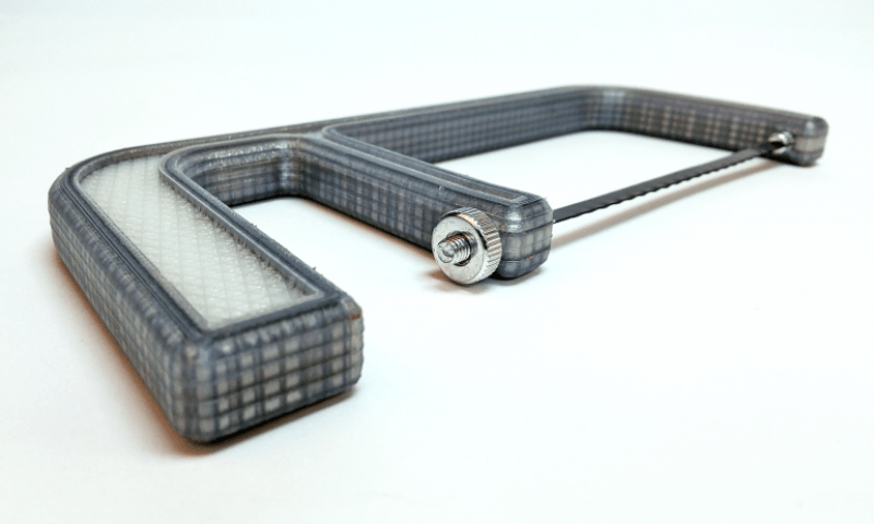 The Markforged 3D printer is an FDM machine optimized for load-bearing parts. The machine prints with a nylon base material, and then can inject continuous strands of carbon fiber or Kevlar into the material to optimize its mechanical properties. If leveraged properly, this enables 3D printed parts to replace aluminum parts.
