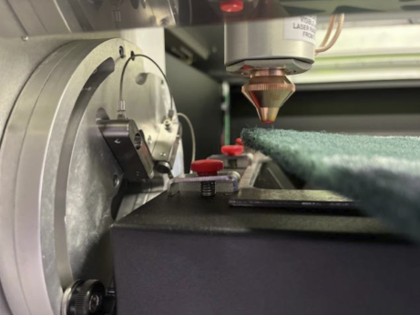 When the job is complete, give the metal at least 30 seconds to cool down, then use a pair of gloves from the computer drawer, open the shield, and remove your piece by unclamping.