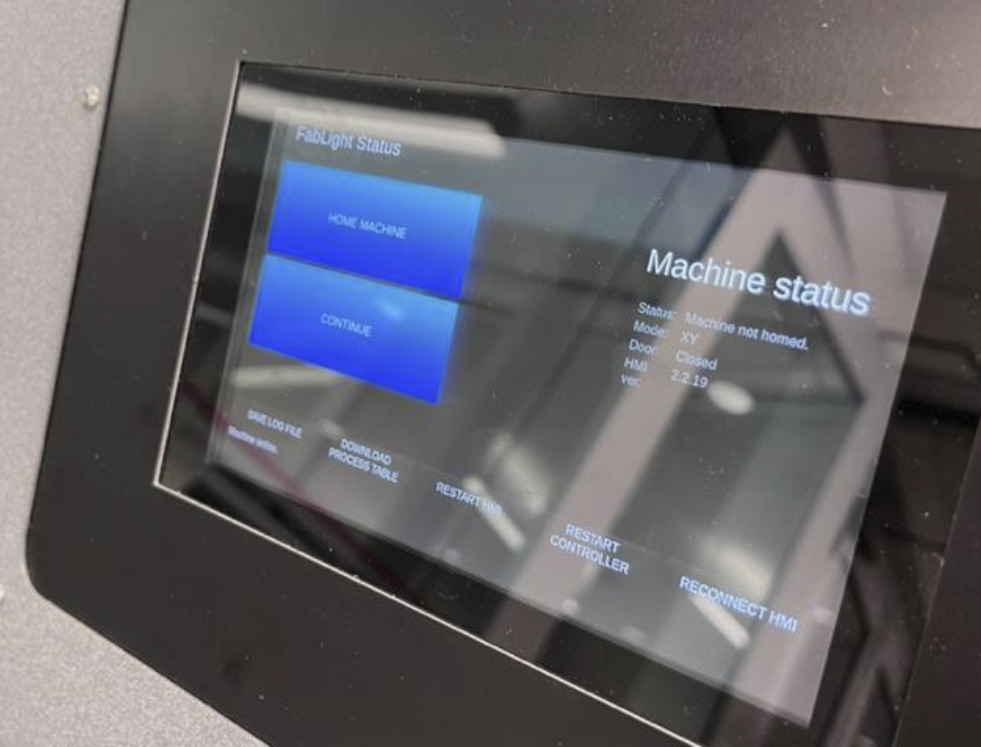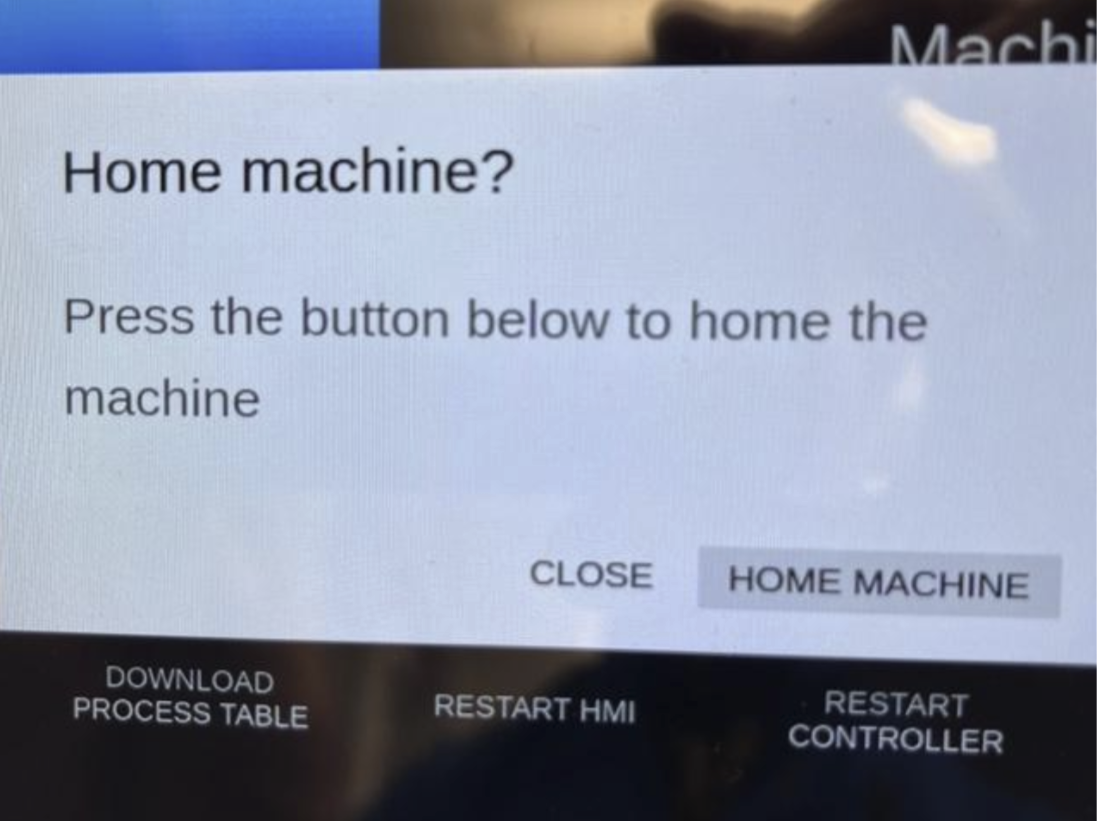 Press Home Machine, and Home Machine again in the pop-up window. After a 15-30 seconds, the machine status will update to “Machine homed”.