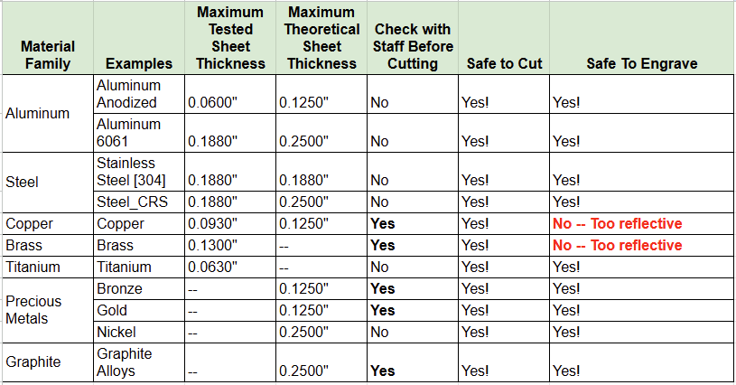 Before using the FabLight, always refer to the Compatible Materials list! If your material is "Undocumented" or otherwise unlisted below, it means the settings for your it are not in our software list yet. Please contact make@rit.edu before proceeding.