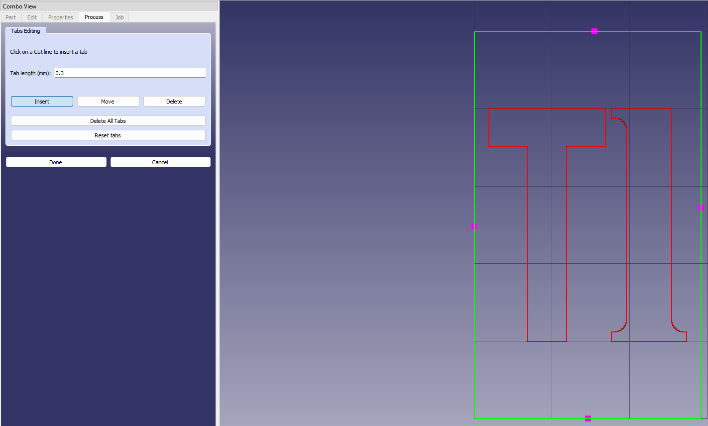 Tabs are small spans that are left uncut to prevent the metal from falling in on itself. The length vary based on material and thickness, but we recommend 0.3mm to start. Try to use at least three, balanced around the center of your cut.