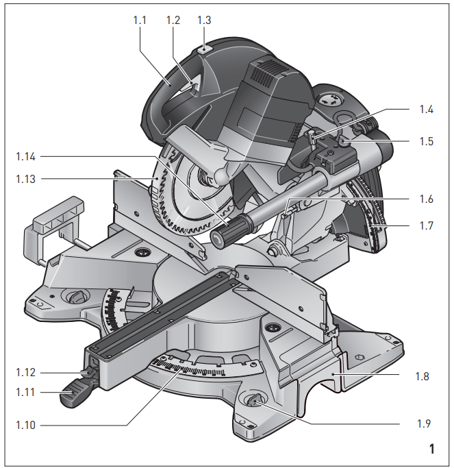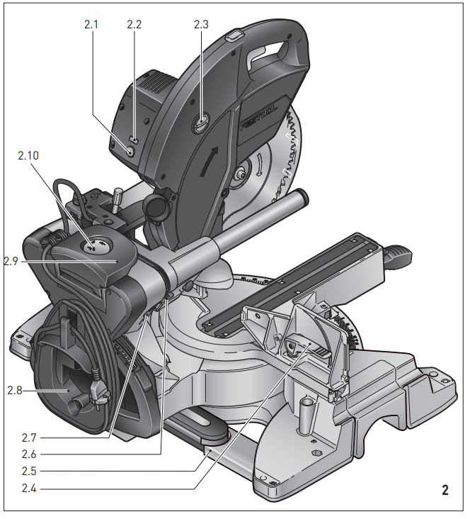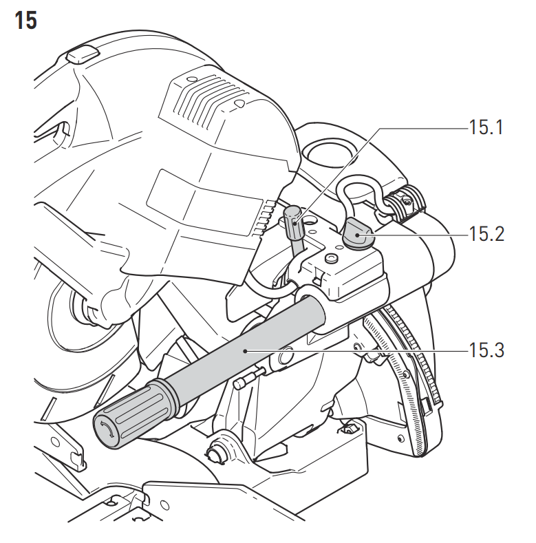 For certain grooving or facing cuts, it may be necessary to stop the sliding mechanism of the miter saw. To do this, move the saw to where you want along the guide rod (15.3), and turn the rotary knob (15.2) to secure it.
