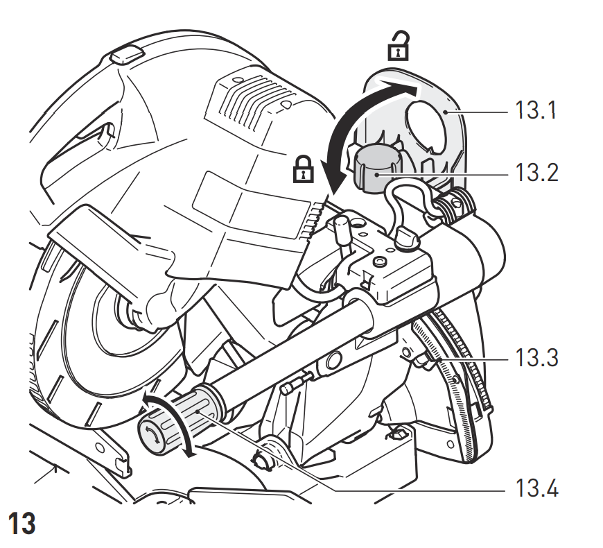 - Swivel the saw until the indicator (13.3) points to the miter angle you would like. You can fine-tune the setting using the rotary handle (13.4).