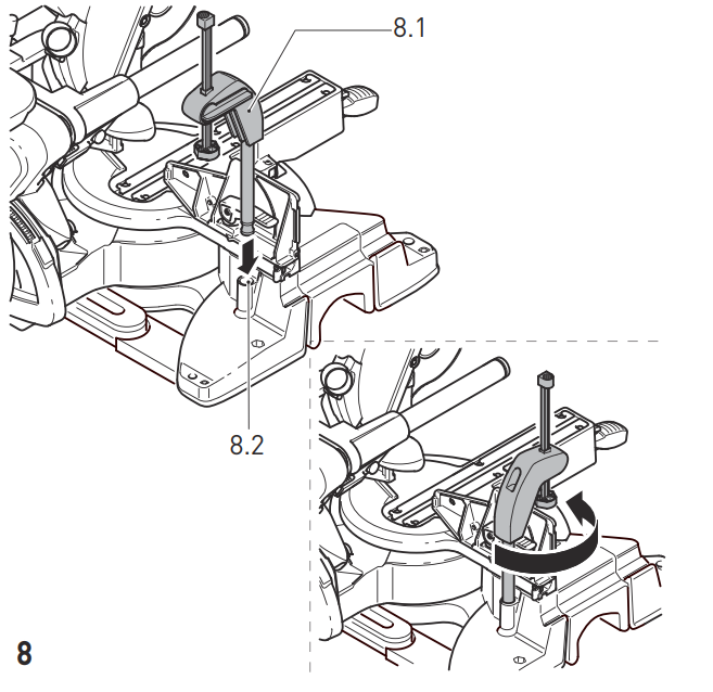 A clamping mechanism can be installed on either side of the saw. It should go on the larger/longer/heavier side of your cut. Remove the clamp (8.1) by rotating it 180 degrees and lifting it from the mounting hole (8.2) behind the fence. Re-install it by inserting into this hole and rotating 180 degrees.