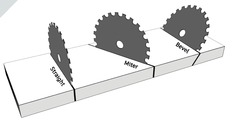 Bevel cuts are at an angle relative to the edge of the material. Bevel cuts are also sometimes referred to as vertical miters.