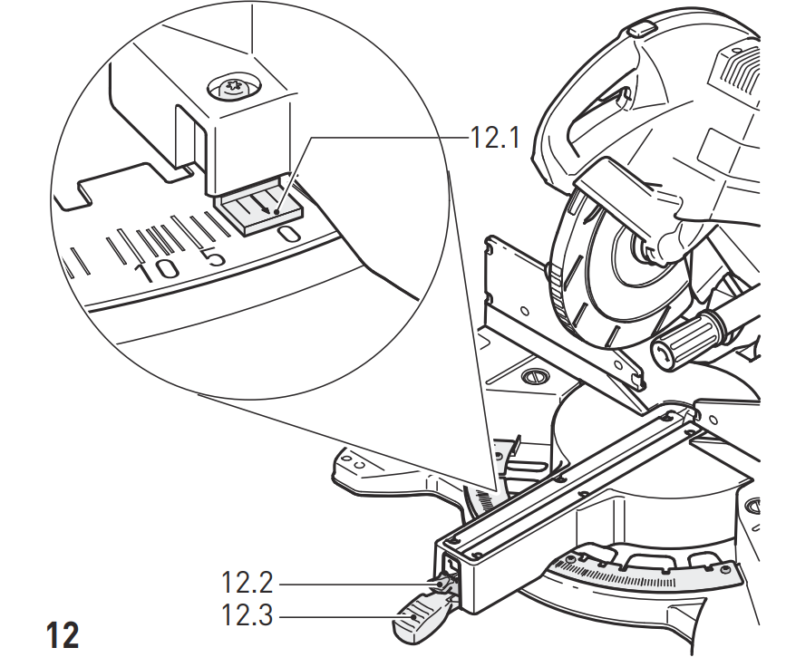 To set a miter angle, first pull the clamping lever (12.3) upwards to unlock the mechanism. Then, press down on the notch lever (12.2). You can now swing the saw to the left or right to set a miter angle.