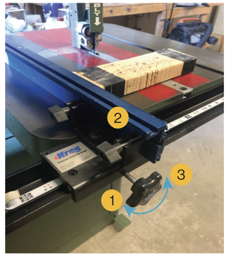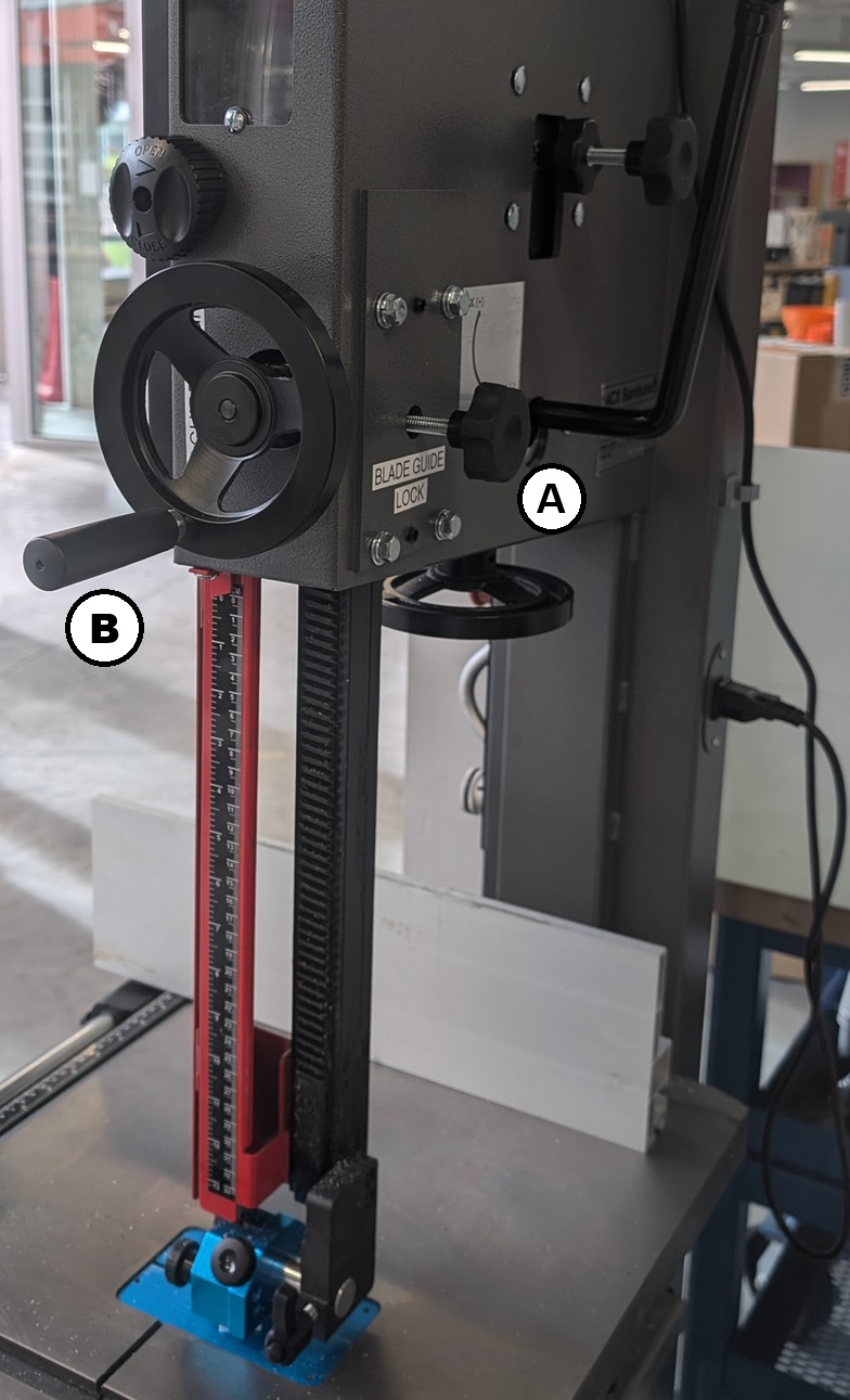 - Positioning your material next to the blade, Use the height adjustment knob (B) to move up or down until it’s a1/8" to 1/4” above the material