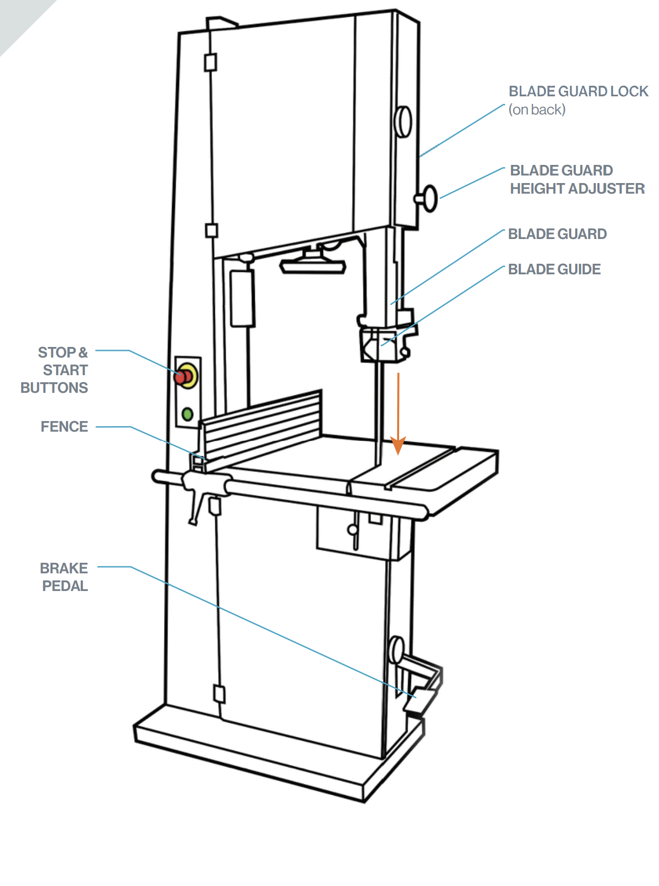 The band saw is driven by large wheels. Upon stopping the machine, a foot brake is available to reduce the speed of the blade.