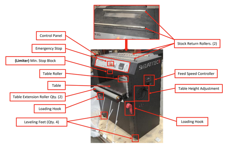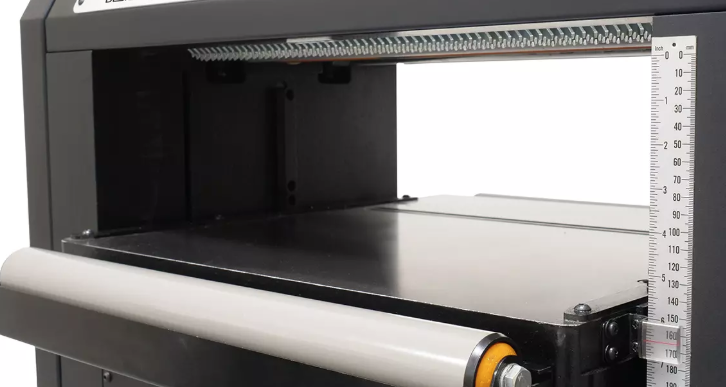 The planer is equipped with a DRO, and Emergency Stop. Along with a feed rate adjustment, located on the right-hand side of the machine. Next to the feed rate adjustment is the table height adjustment.