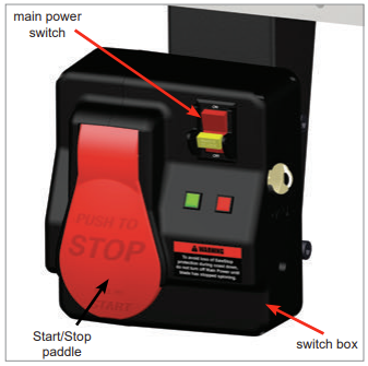 The tablesaw has a two-step switch for turning on the machine. The Start/Stop must be depressed before flipping the main power switch. Wait until the Red and Green lights are at a solid green before pulling the Start/Stop Paddle.