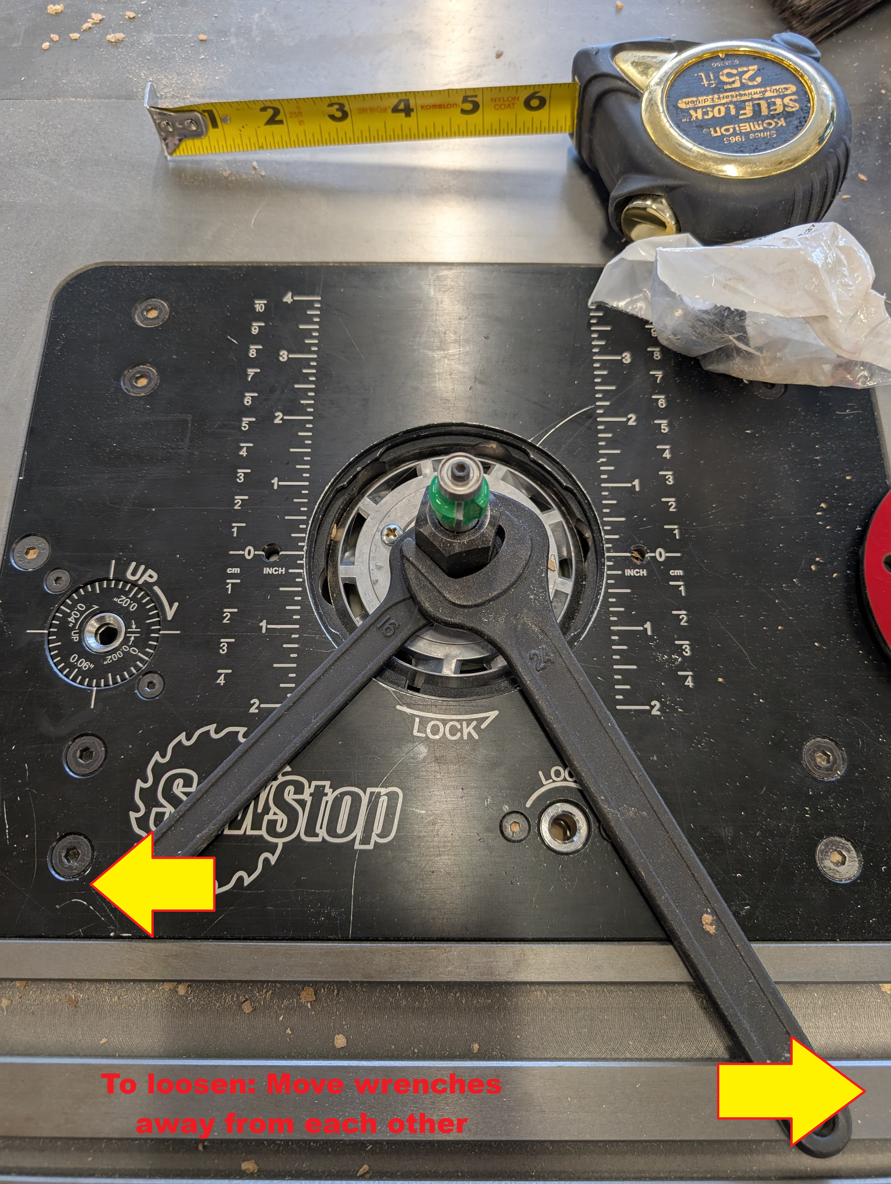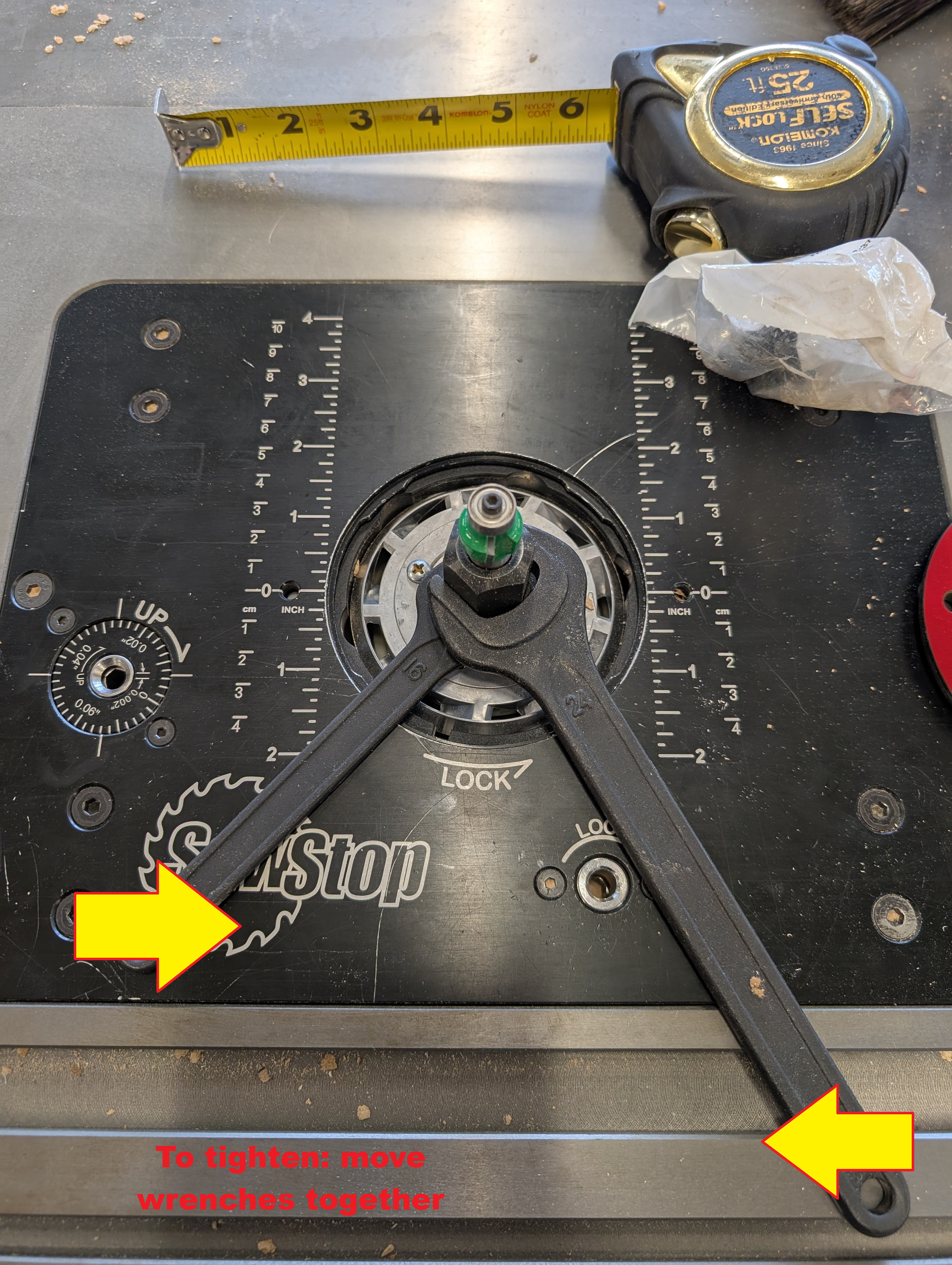 Once the table has been raised, you can see the collet and nut that hold the router bit in. This router uses two wrenches to loosen and tighten the collet.