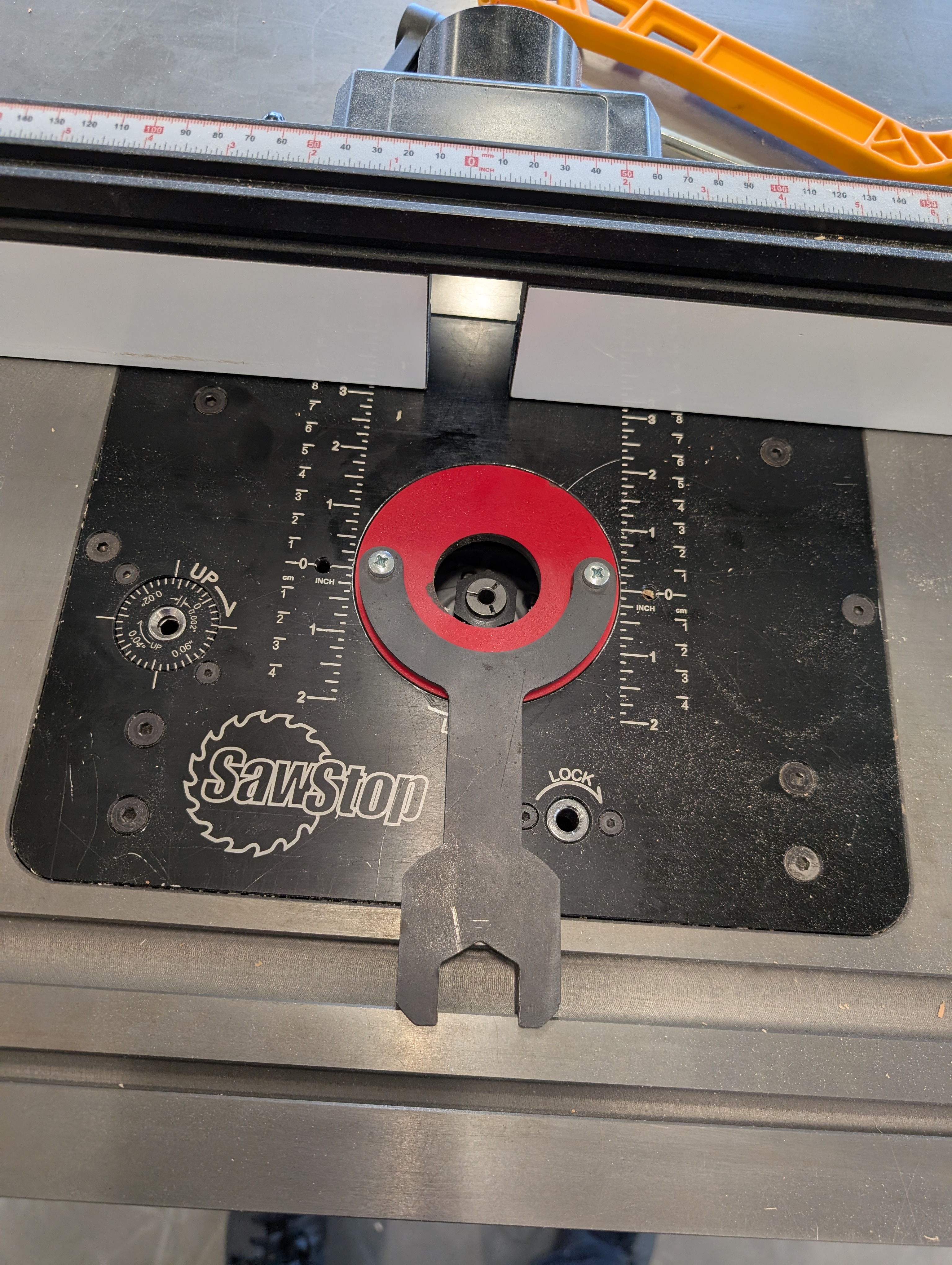 In order to keep everything contained, the router exists below a throat plate (red) and is below the table.