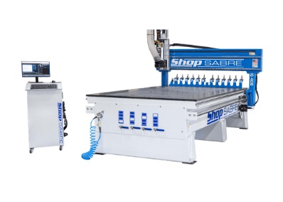 The ShopSabre IS-510 is a large format CNC router. This machine takes in gcode from software such as Autodesk Fusion or vCarve to cut woods and plastics.